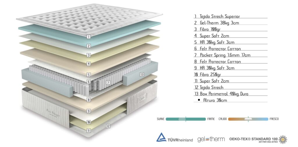 Este colchón cuenta con los certificados TüVRheinland, geltherm y OEKO-TEX, que avalan la gran calidad de sus materiales.